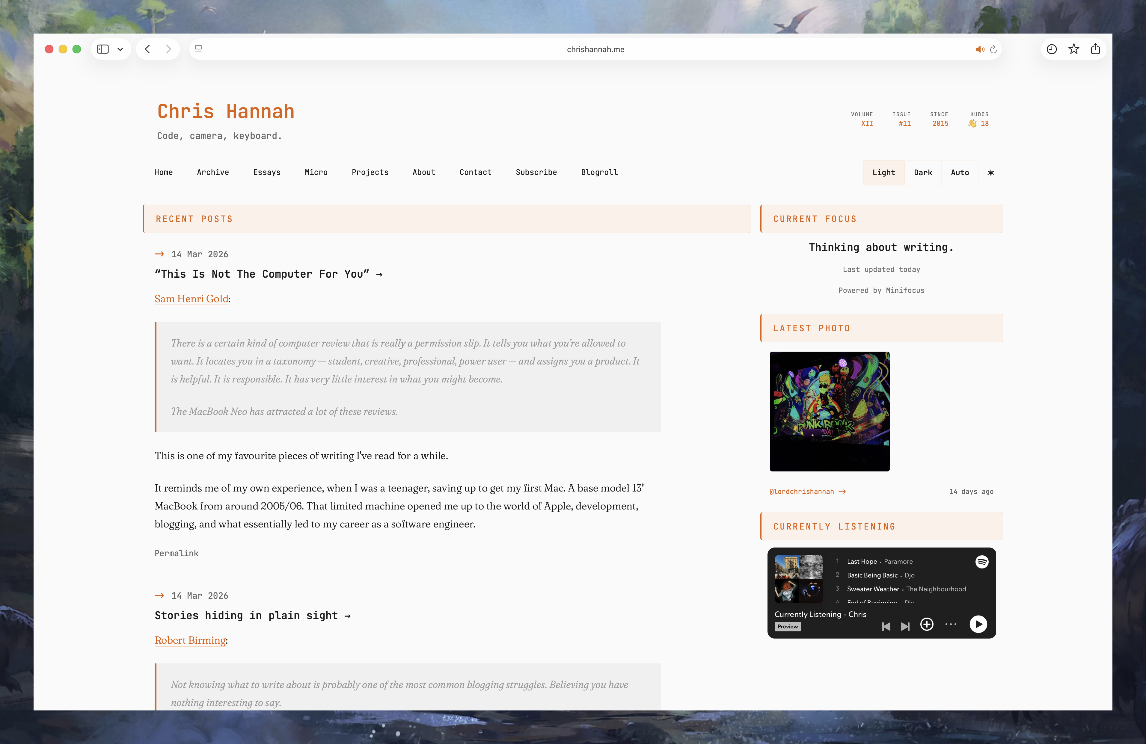 I want a personal blog, I want a blog for technology opinions, I want another for more refined essays, I want to also have a super frequent micro blog, and I’m sure there are more. With each of these comes friction. Should I keep it on one blog? One domain? How do I somehow connect everything together? Does it matter? Does my writing need to live forever?